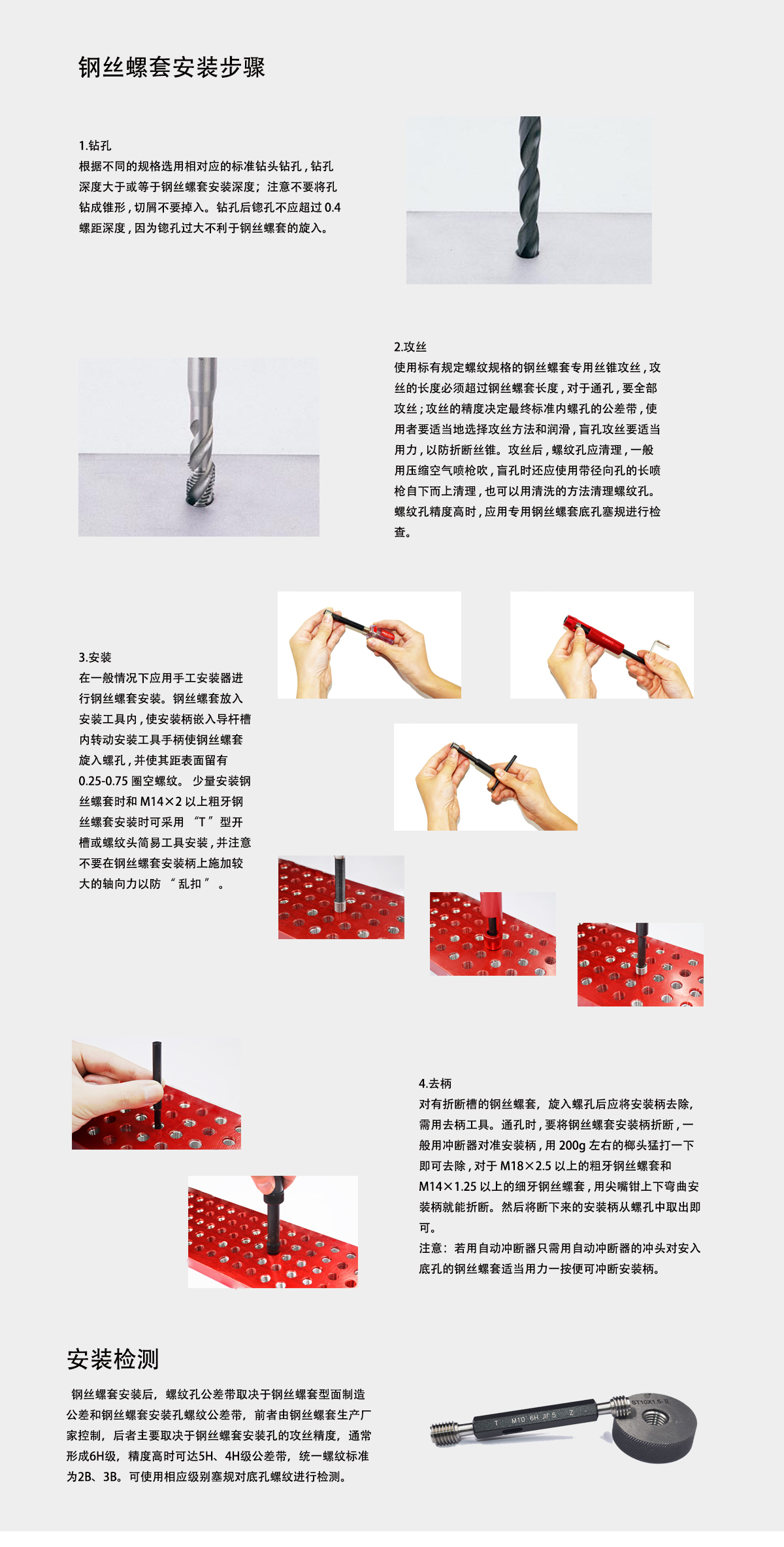 5、便于維修。將損壞的螺孔裝入鋼絲螺套,修復后可以繼續使用,避免工件報損的可能。